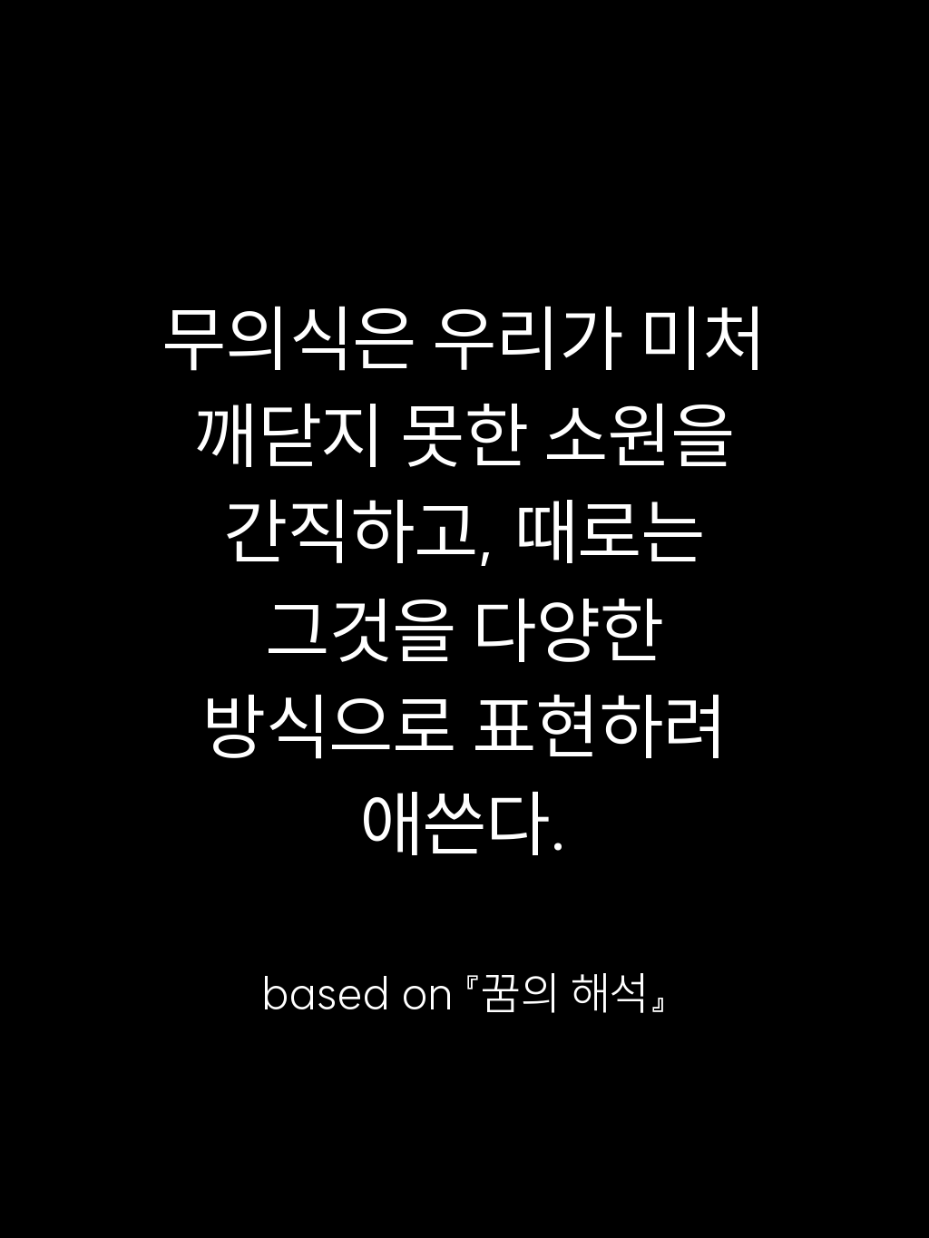 • 무의식은 우리가 미처 깨닫지 못한 소원을 간직하고, 때로는 그것을 다양한 방식으로 표현하려 애쓴다. – based on 『꿈의 해석』