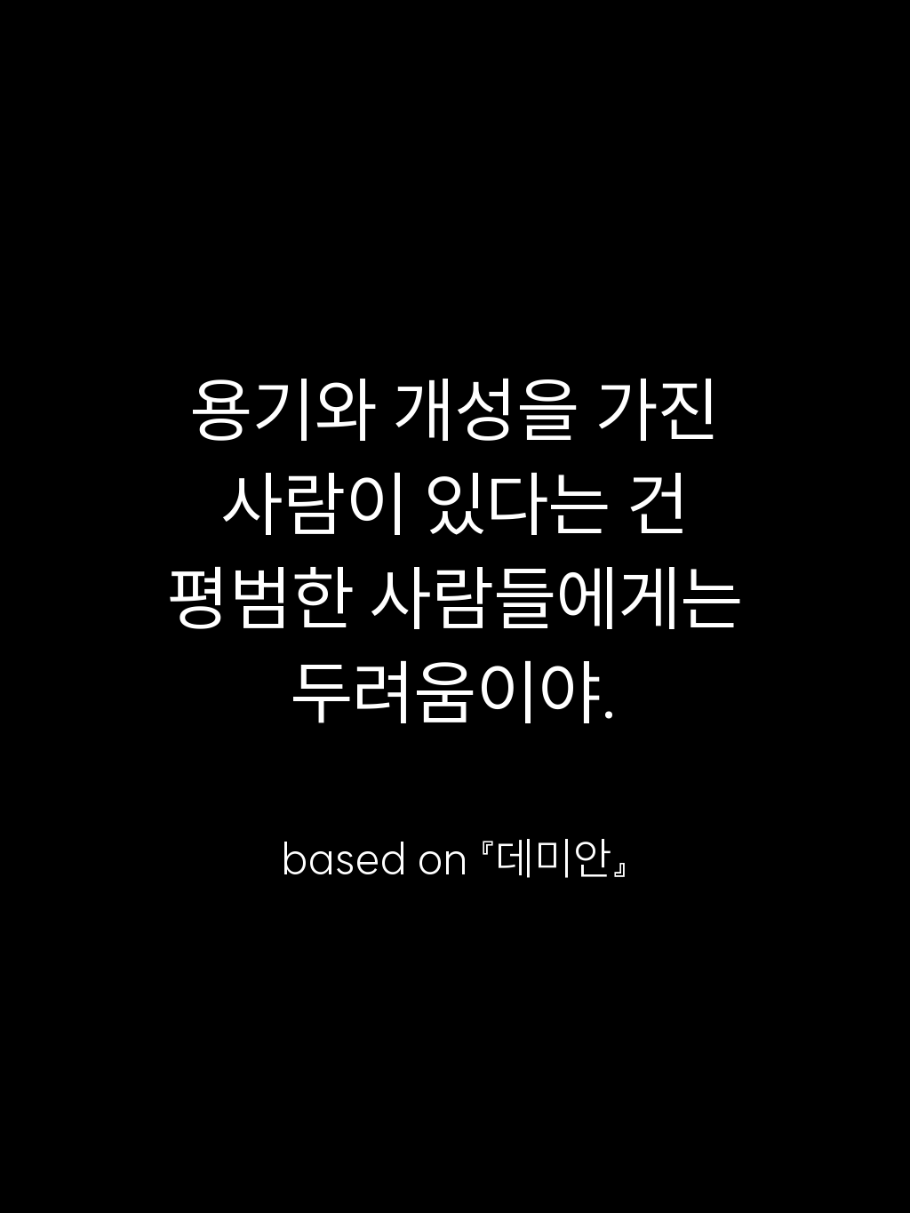 • 용기와 개성을 가진 사람이 있다는 건 평범한 사람들에게는 두려움이야. – based on 『데미안』