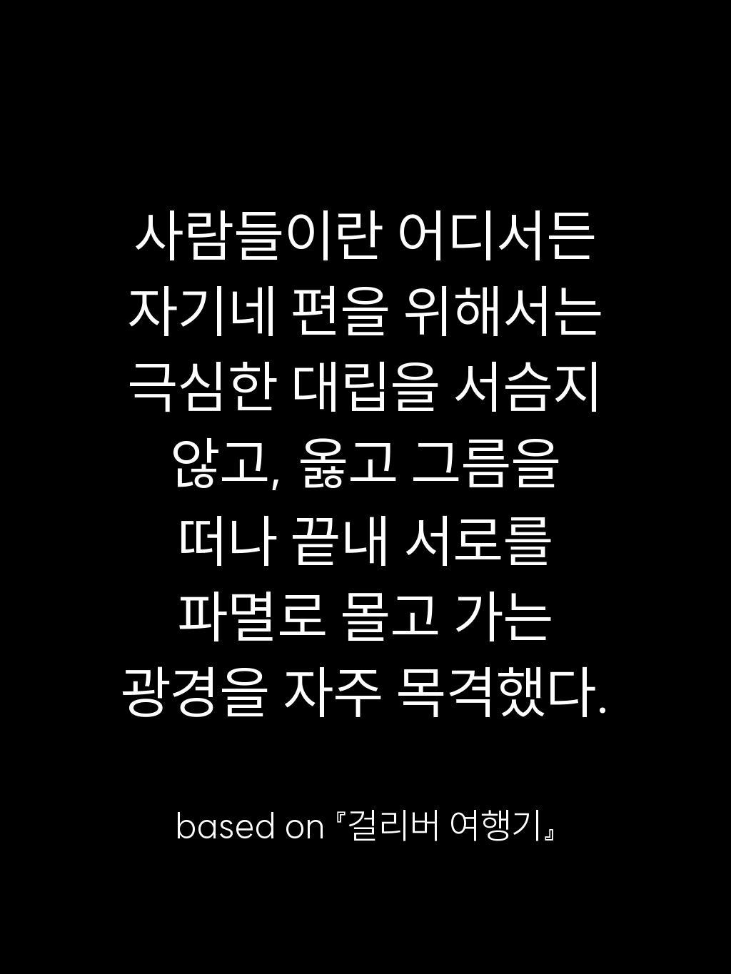 • 사람들이란 어디서든 자기네 편을 위해서는 극심한 대립을 서슴지 않고, 옳고 그름을 떠나 끝내 서로를 파멸로 몰고 가는 광경을 자주 목격했다. – based on 『걸리버 여행기』