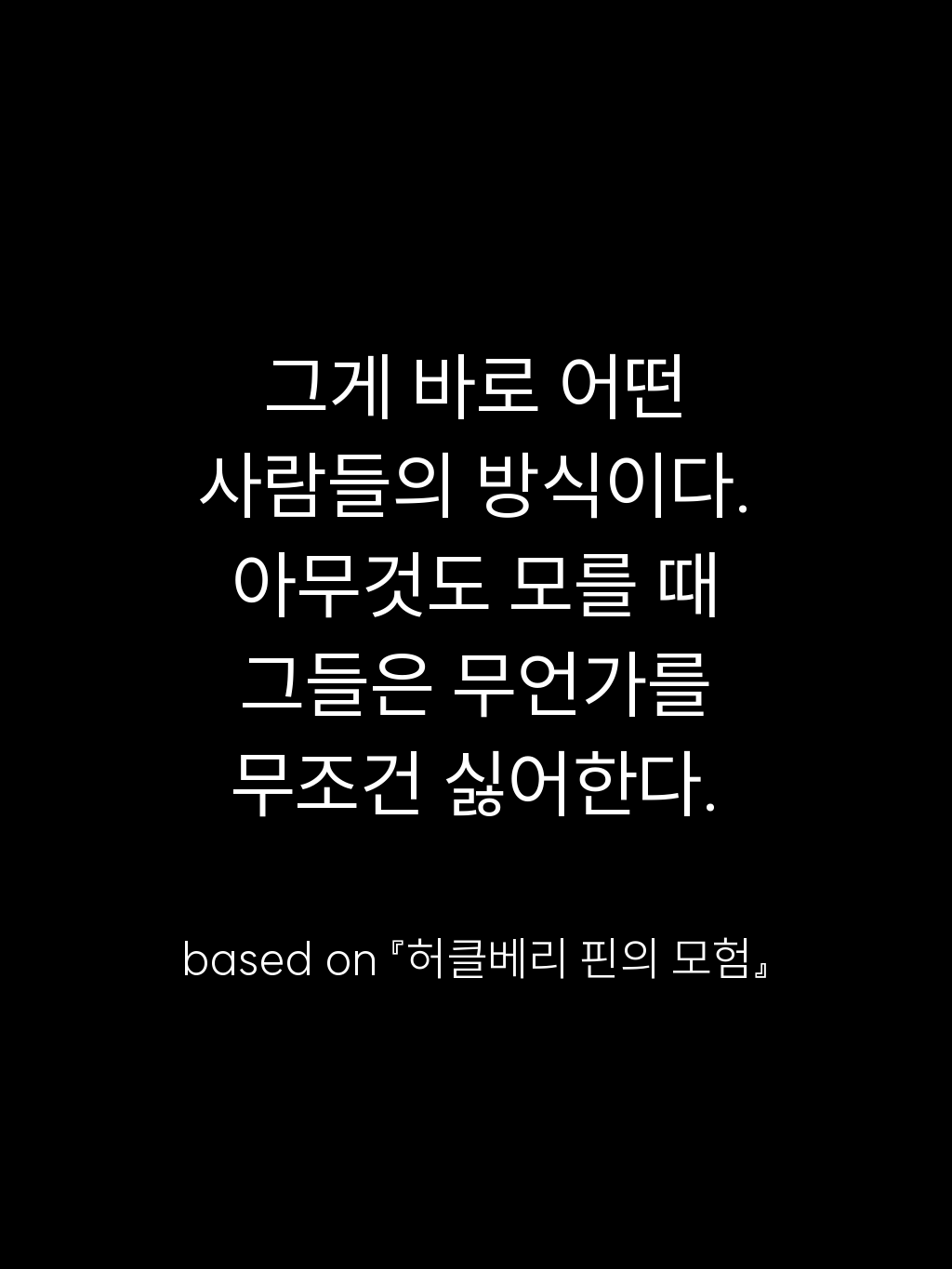 • 그게 바로 어떤 사람들의 방식이다. 아무것도 모를 때 그들은 무언가를 무조건 싫어한다. – based on 『허클베리 핀의 모험』