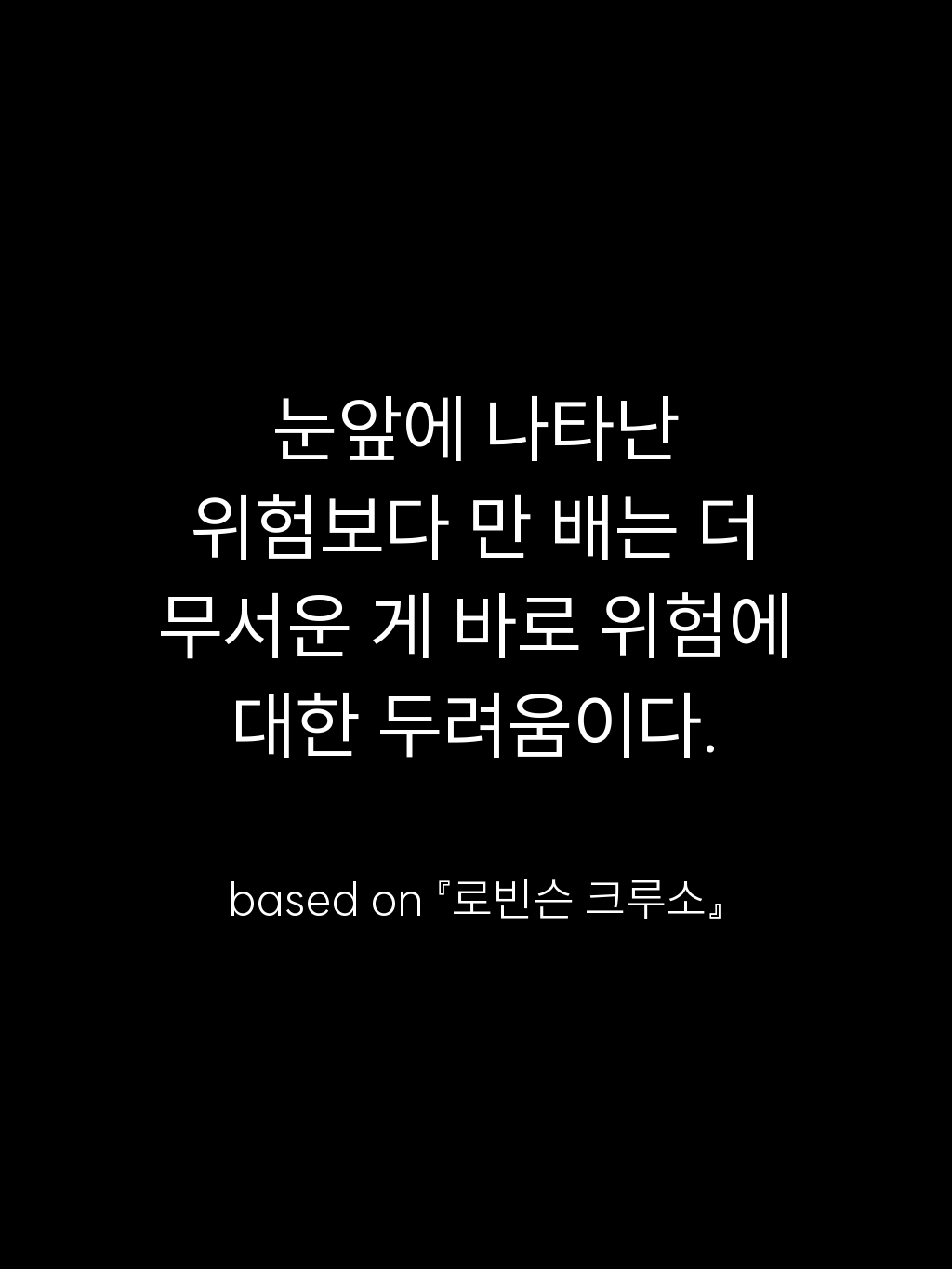 • 눈앞에 나타난 위험보다 만 배는 더 무서운 게 바로 위험에 대한 두려움이다. – based on 『로빈슨 크루소』
