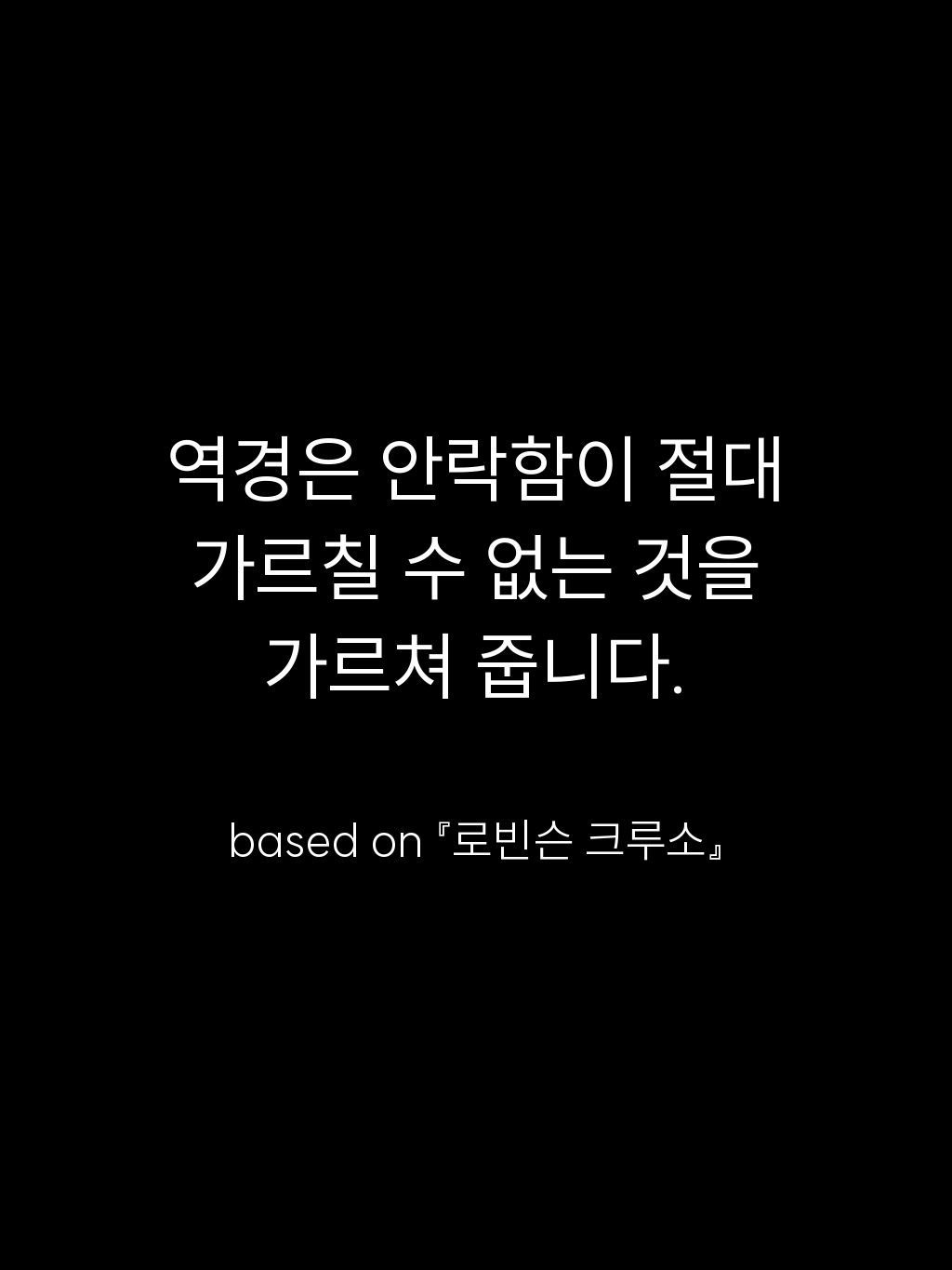 • 역경은 안락함이 절대 가르칠 수 없는 것을 가르쳐 줍니다. – based on 『로빈슨 크루소』