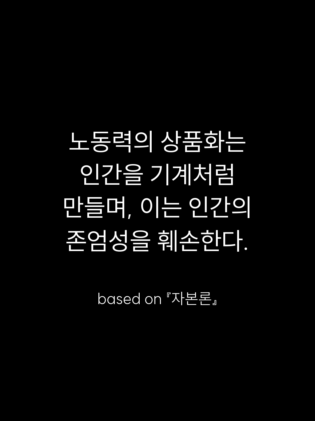 • 노동력의 상품화는 인간을 기계처럼 만들며, 이는 인간의 존엄성을 훼손한다. – based on 『자본론』