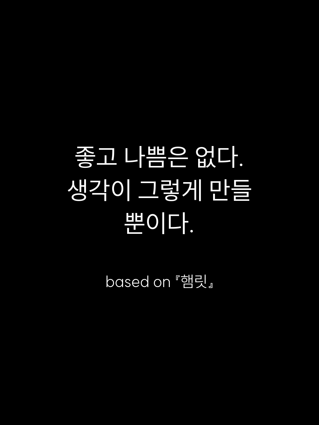 • 좋고 나쁨은 없다. 생각이 그렇게 만들 뿐이다. – based on 『햄릿』