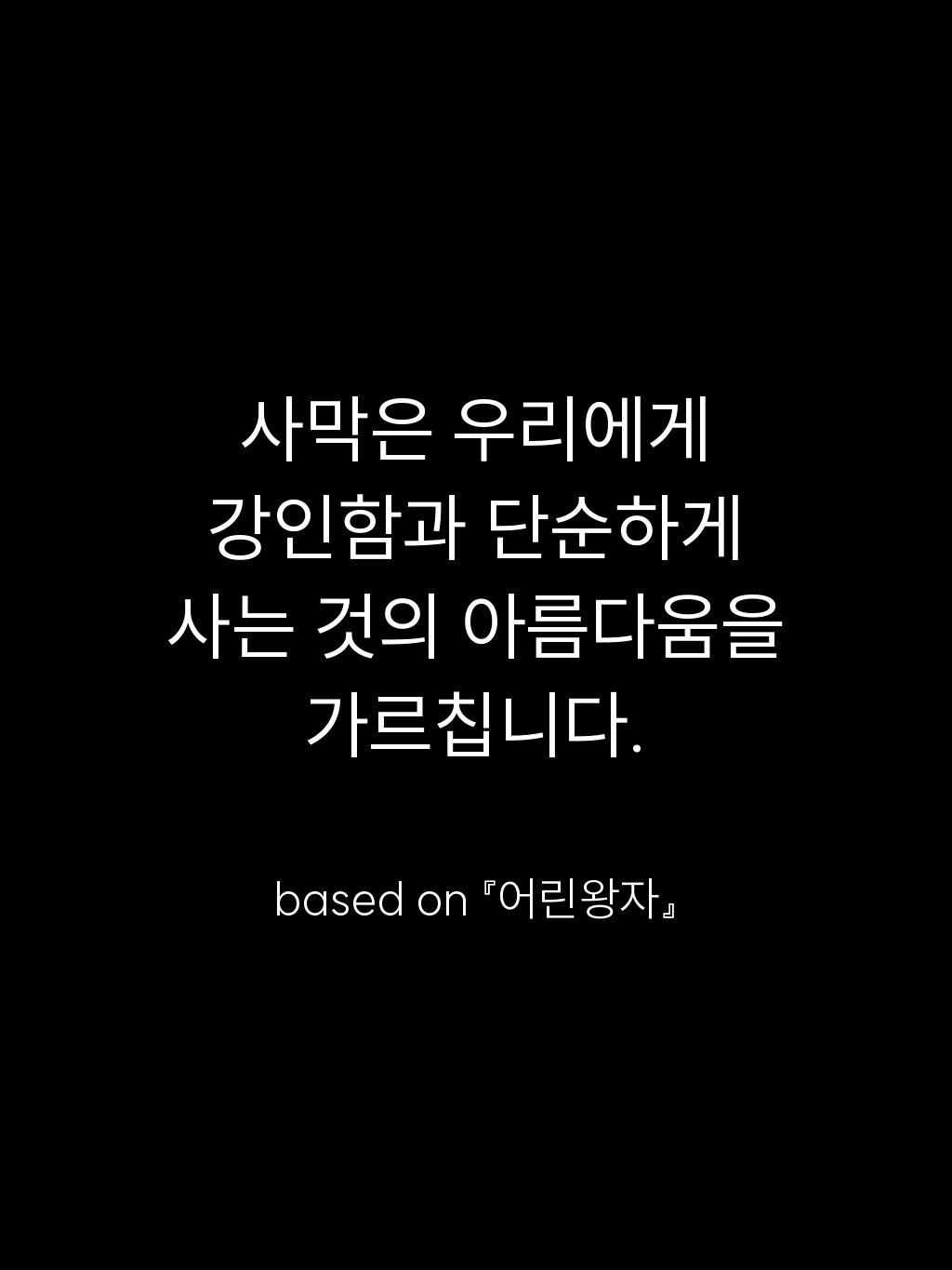 • 사막은 우리에게 강인함과 단순하게 사는 것의 아름다움을 가르칩니다. – based on 『어린왕자』