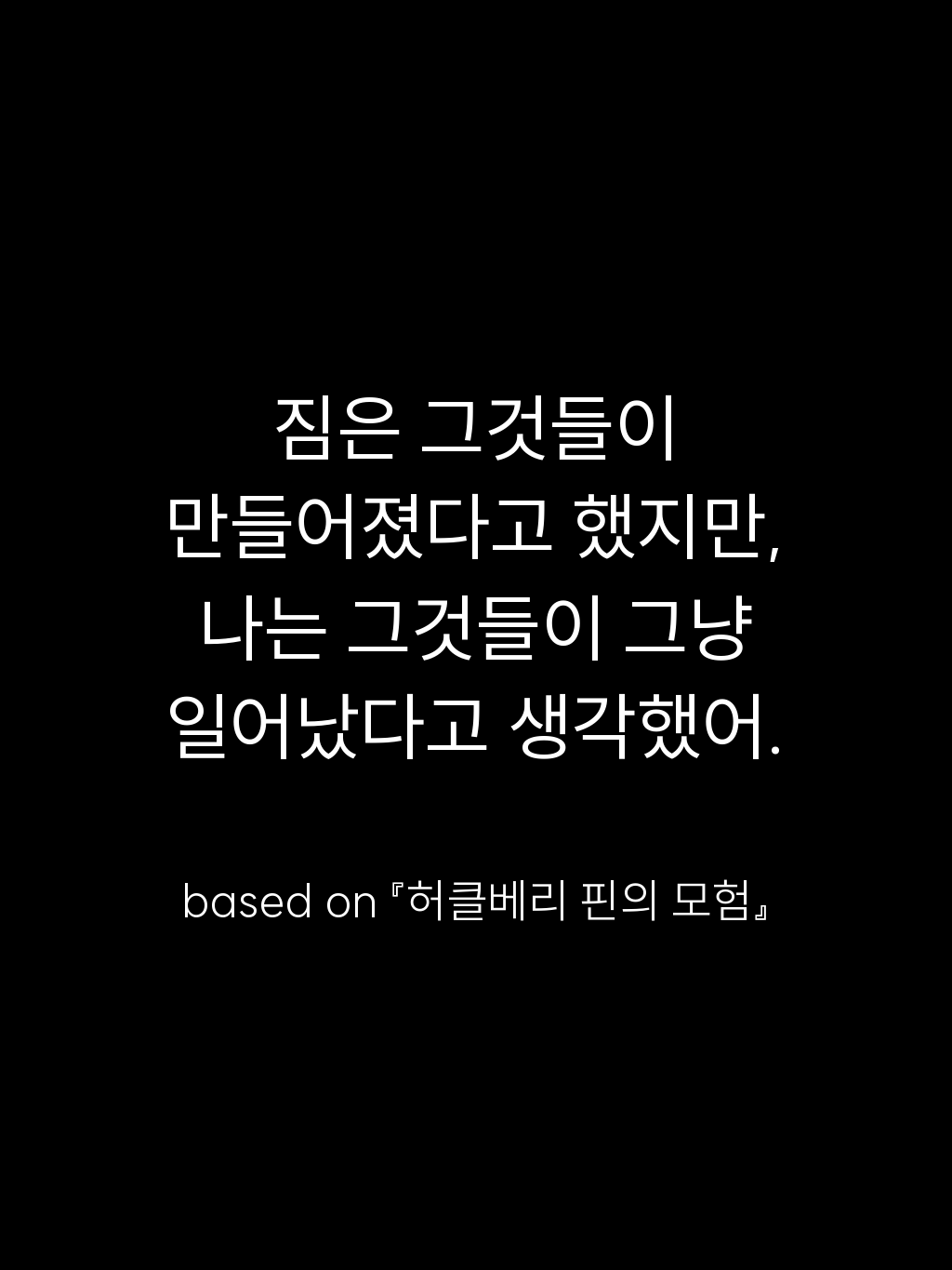 • 짐은 그것들이 만들어졌다고 했지만, 나는 그것들이 그냥 일어났다고 생각했어. – based on 『허클베리 핀의 모험』