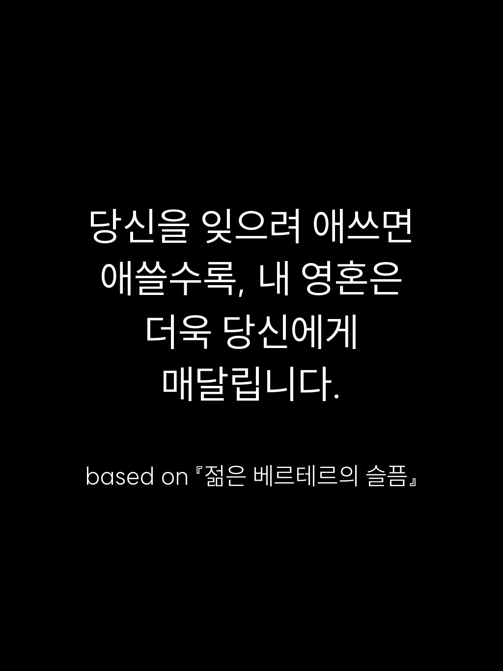 • 당신을 잊으려 애쓰면 애쓸수록, 내 영혼은 더욱 당신에게 매달립니다. – based on 『젊은 베르테르의 슬픔』