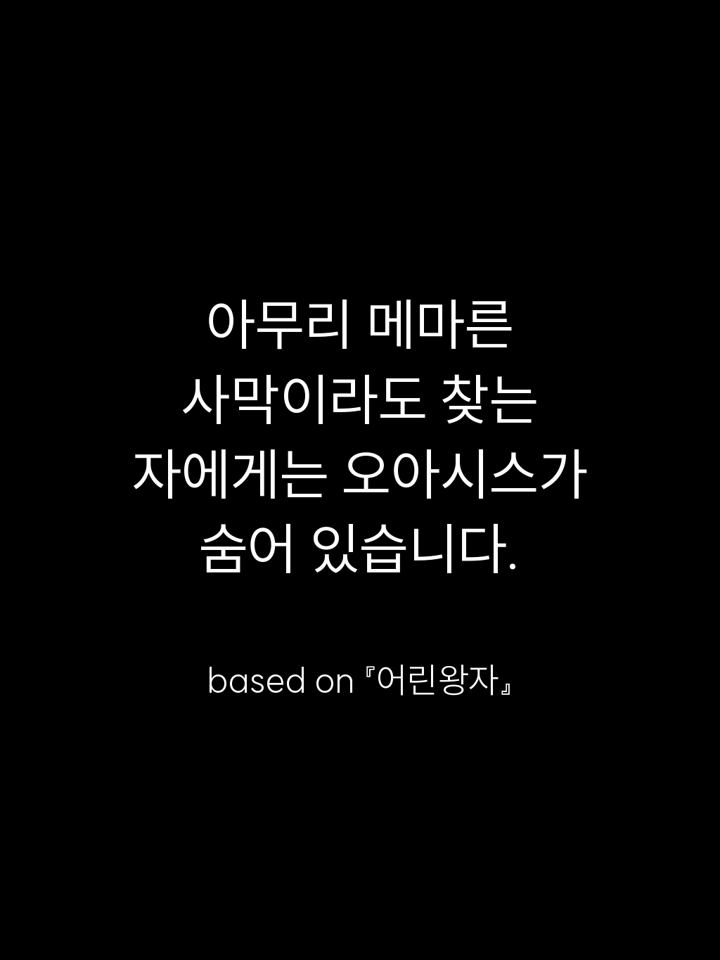 • 아무리 메마른 사막이라도 찾는 자에게는 오아시스가 숨어 있습니다. – based on 『어린왕자』