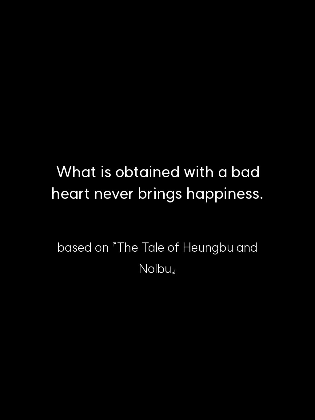 • What is obtained with a bad heart never brings happiness. – based on 『The Tale of Heungbu and Nolbu』