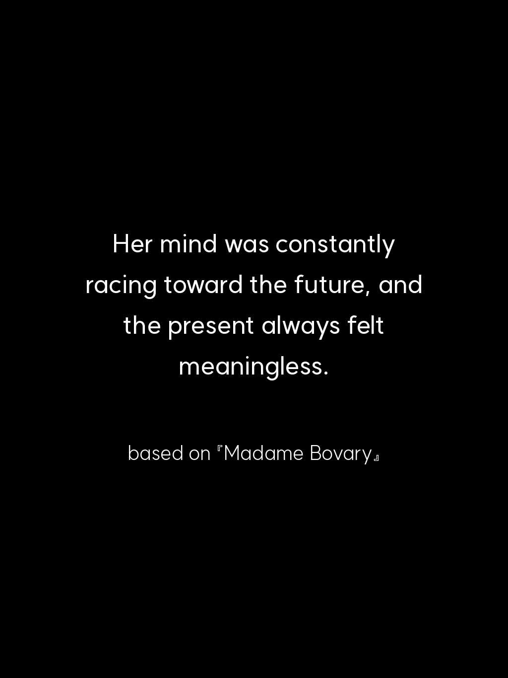 • Her mind was constantly racing toward the future, and the present always felt meaningless. – based on 『Madame Bovary』